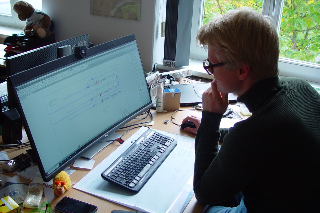 Lars‘ Hauptarbeitsort ist das Büro. Hier wurde er in den technischen Vertrieb für die Gebäudetechnik eingearbeitet, ist im Kontakt mit Kunden und übernimmt jetzt mit etwas mehr Berufserfahrung eigene Projekte.